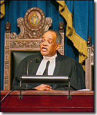 At the invitation of Speaker of the House Thomas M. Finneran, Plummer Professor of Christian Morals and Pusey Minister in the Memorial Church Reverend Peter J. Gomes recently addressed the Massachusetts House of Representatives. The speech was part of Finnerans Lyceum series, which brings special guests before the House to present their thoughts on a wide range of topics. Gomes spoke eloquently and humorously about “The Common-Wealth and the Civic Imagination: Cherishing the Public Mind,” which was very well received by all assembled.