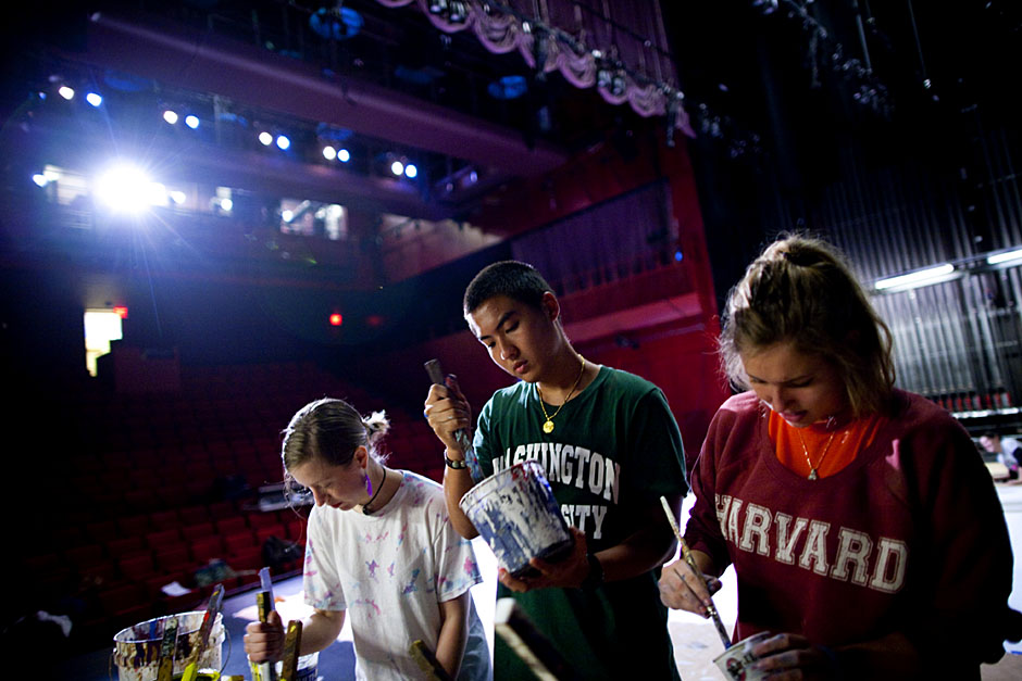 Incoming freshmen in the Freshman Arts Program (FAP) conduct rehearsals and preparations for their annual pageant in the New College Theatre at Harvard University. Ty Walker ’14 helps with design, painting an “H” for Harvard and, of course, his new home. Stephanie Mitchell/Harvard Staff Photographer Alastair Su ’14 of the musical composition team lays down some tracks. Stephanie Mitchell/Harvard Staff Photographer Ginny Fahs ’14 (left) and Megan McDonnell ’14 paint some Harvard against the Boston skyline. Stephanie Mitchell/Harvard Staff Photographer Charlotte Chang ’14 (from left), Georgia Shelton ’14, Xiaoxiao Wu ’14, and Riana Balahadia ’14 rehearse for the big event. Stephanie Mitchell/Harvard Staff Photographer It’s rough work for Ty Walker ’14 (from left), Sam Rashba ’14, and Matt DaSilva ’12, but the show must go on! Stephanie Mitchell/Harvard Staff Photographer More elbow grease! Samantha Berstler ’14 (from left), Alec Yeh ’14, and Megan McDonnell ’14 stir the paint. Stephanie Mitchell/Harvard Staff Photographer Script writers Riana Balahadia ’14 (from left), Xiaoxiao Wu ’14, and Georgia Shelton ’14 bounce around ideas in a room filled with brainstorming writers. Stephanie Mitchell/Harvard Staff Photographer Meisha Brooks ’14 (from left) of Boston and Tony Oblen ’14 of Maryland harmonize and help plan the pageant’s music. Stephanie Mitchell/Harvard Staff Photographer These freshmen â Alastair Su ’14 (from left), Michael Wu ’14, and Liv Redpath ’14 â hammer out the finishing touches for the pageant’s score. Stephanie Mitchell/Harvard Staff Photographer Donât forget your lines! Brooke Griffin ’14 (from left), Ginny Fahs ’14, and Diana Miao ’14 prep the set. Stephanie Mitchell/Harvard Staff Photographer I think weâre alone now ⦠Alastair Su ’14 (right) collaborates with other musicians in a quiet nook of the theater. Stephanie Mitchell/Harvard Staff Photographer Chin up, chin up! Megan McDonnell â14 (right, in red) listens to pageant rehearsals. Stephanie Mitchell/Harvard Staff Photographer Students from the art and design group powwow with other students and discuss the details of the show. Stephanie Mitchell/Harvard Staff Photographer Speak your mind. Katherine Price ’14 and Eric Brewster ’14 discuss the script. Stephanie Mitchell/Harvard Staff Photographer Behind the dry erase board, Aviva Hakanoglu ’14 (right) conjures magic in a drum rehearsal for the pageant. Stephanie Mitchell/Harvard Staff Photographer Ben Silva ’14 (arms in air) runs lines with his fellow cast members. Stephanie Mitchell/Harvard Staff Photographer Away from it all ⦠and in a stairwell. Aviva Hakanoglu ’14, Meisha Brooks ’14, and Ali Slaight ’14 focus in a quiet space. Stephanie Mitchell/Harvard Staff Photographer Freshmen work to complete the pageant backdrop. Stephanie Mitchell/Harvard Staff Photographer Ginny Fahs ’14 (from left), Megan McDonnell ’14, and Alec Yeh ’14 coat the stage under the direction of seasoned scene painter Peter Miller ’82. Stephanie Mitchell/Harvard Staff Photographer Putting a shine on! The New College Theatre stage gets a makeover as pageant preparations get under way. Stephanie Mitchell/Harvard Staff Photographer The First-Year Outdoor Program is Harvardâs largest and oldest pre-orientation program. Trip leader Emma Franklin ’12 (center, in pink shorts) leads the group in New Hampshire.
