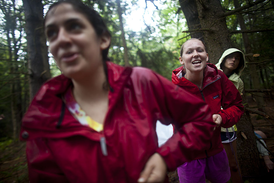 Justin Ide/Harvard Staff Photographer Trip leader Emma Franklin ’12 (center) yells encouragement while setting up camp with the help of Leah Schulson (left) and Katya Johns.