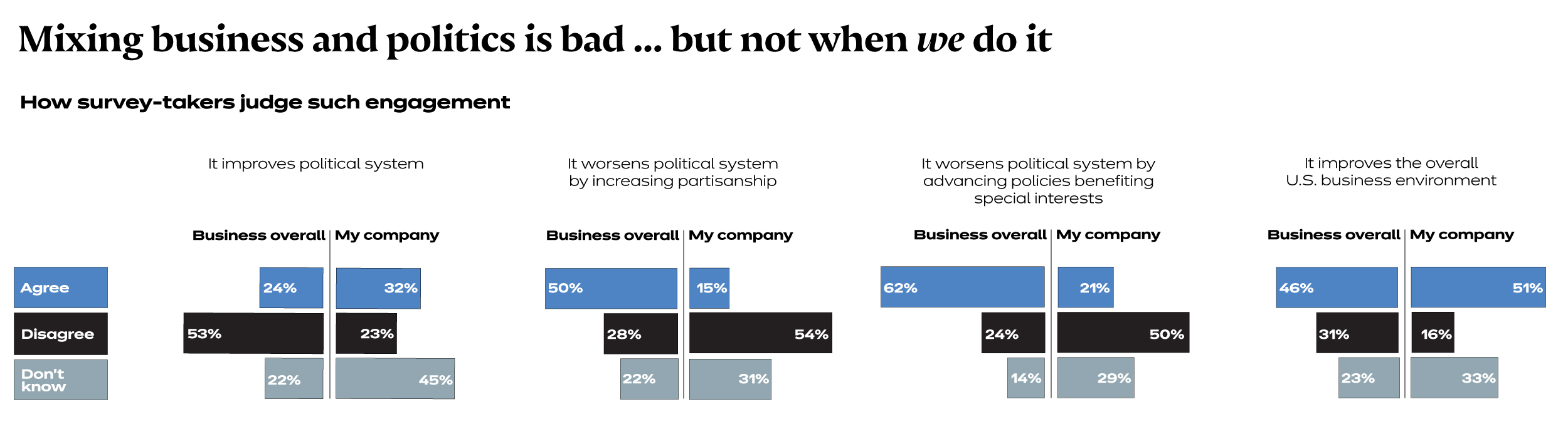 While most said they thought mixing politics and business as a whole did not help the country over the long haul, few believed that whatever their firm was up to politically undermined democracy or harmed society’s trust in business.