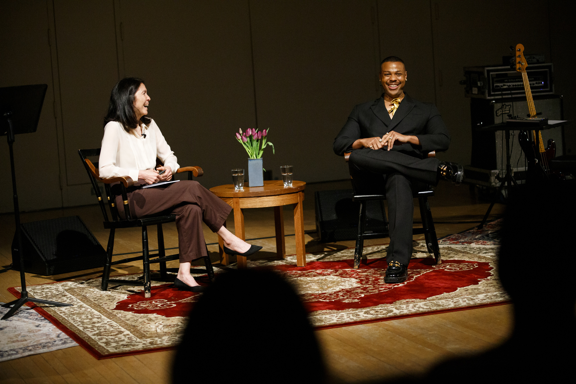Tines (right) smiles during a conversation with Diane Paulus, the Terrie and Bradley Bloom Artistic Director at American Repertory Theater.