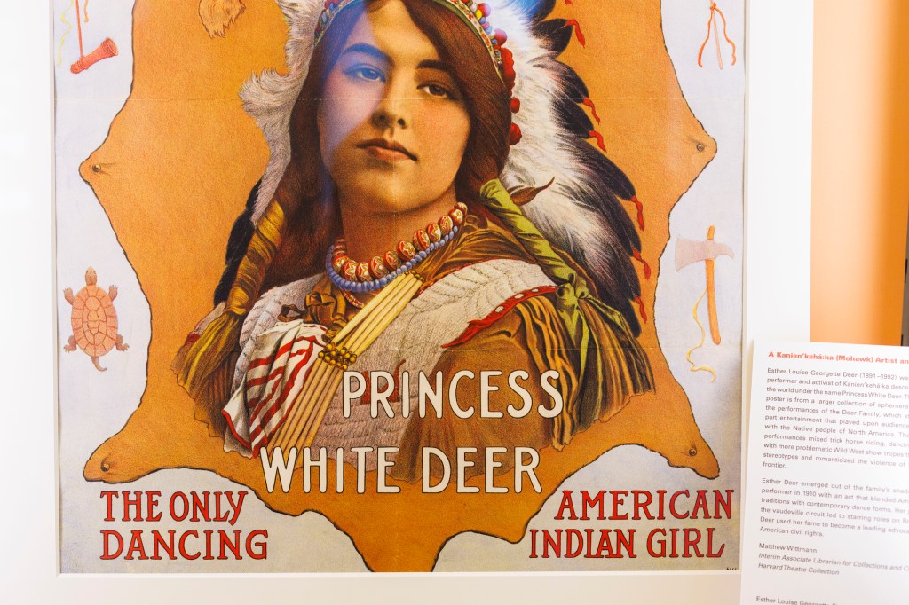 The poster on display in Houghton’s exhibit is part of a larger collection of ephemera documenting the performances of the Deer family, who became known for their shows that mixed trick horse riding, dancing, and songs with romanticized tableaux depicting Native people on the American frontier.