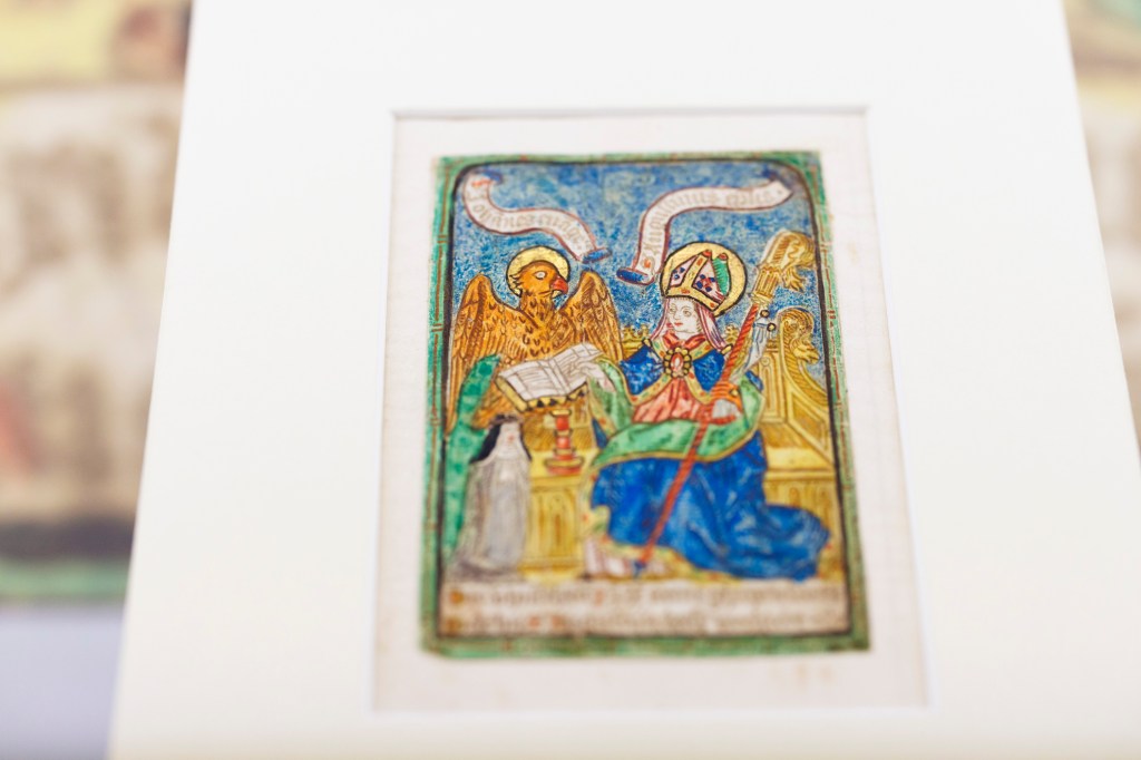 Devotional leaf featuring Saint Augustine with the Eagle of Saint John and Saint Bridget.