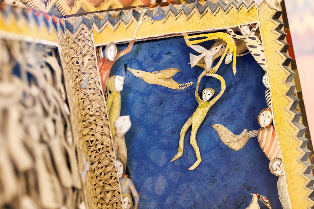 Houghton recently acquired a copy of her 2022 artist’s book “Haute Volée” — which translates roughly into “High Flying” or “High Class.” The imagery includes distinctive human and nonhuman figures alongside folkloric patterns and bold color blocks.