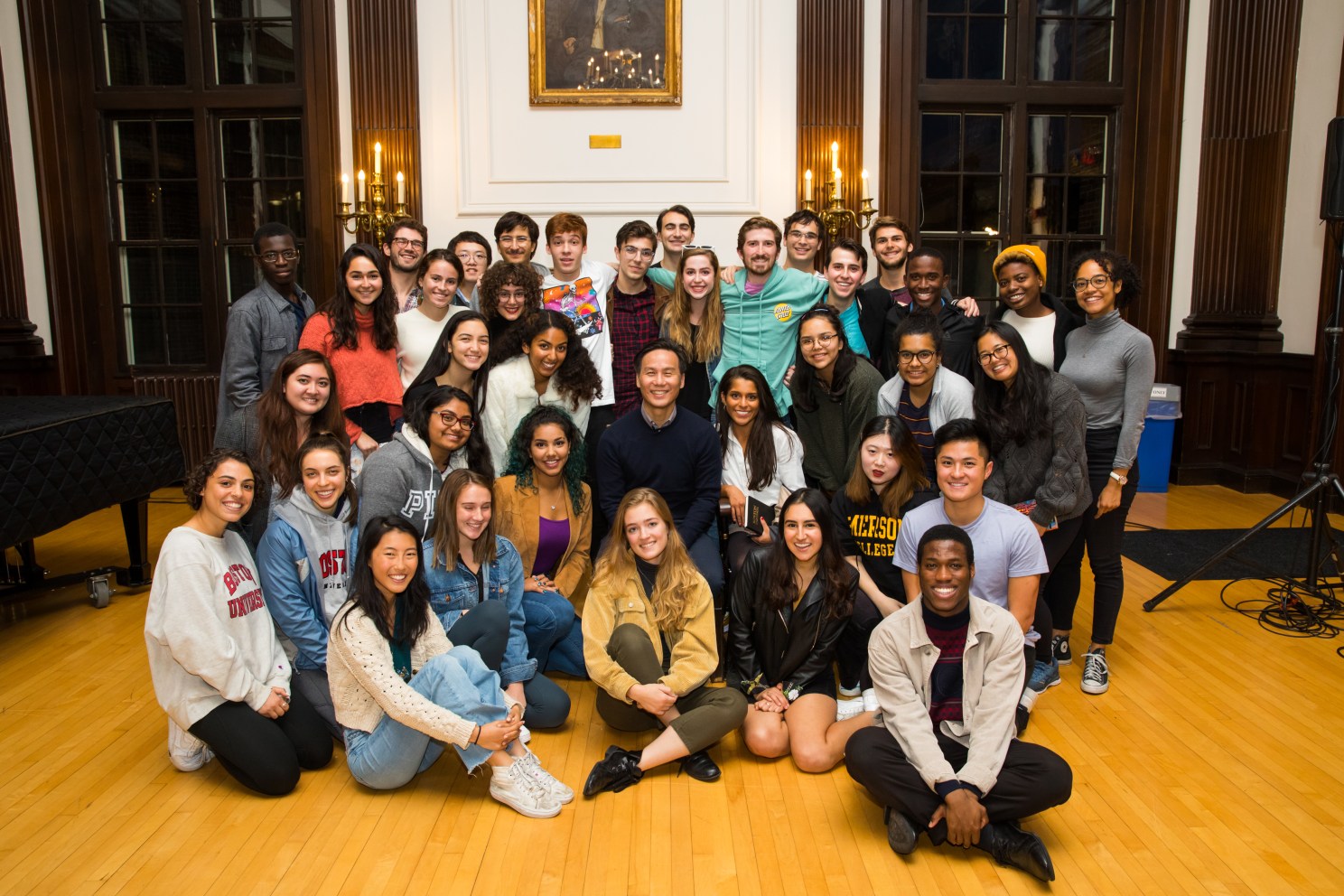 Actor BD Wong (center) poses with students after a master class event at Agassiz Theatre in fall 2019.