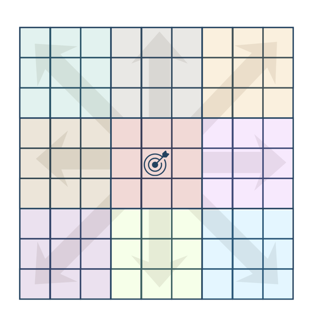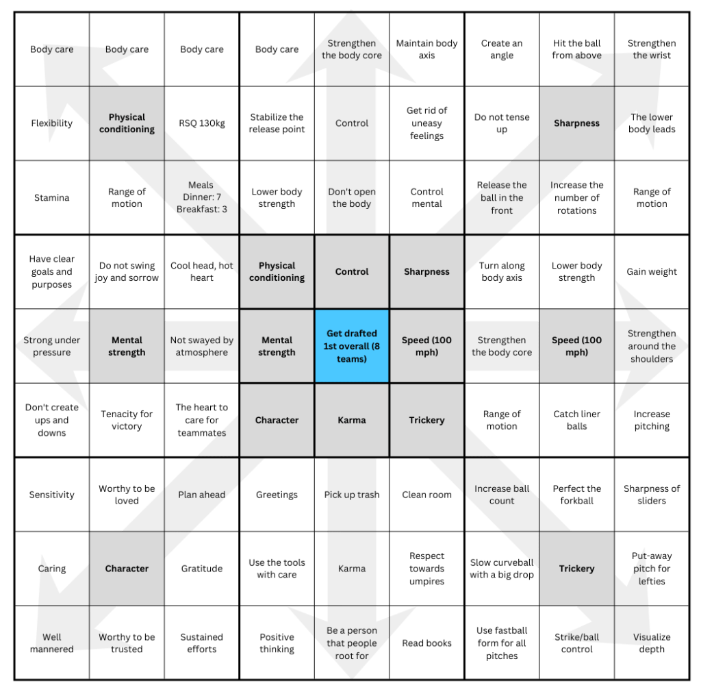 You come up with a multiyear ambition; so really dare to dream. And then, the first step of the chart is, “What are the set of things that if I concentrated on this year, I’d make meaningful progress on my multiyear ambition?” You have one thing in the center: my multiyear ambition. For him, it was “be the No. 1 draft pick” four years later. And then, what are the eight things that if I did this year, I would make progress on my ambition? He had “physical conditioning” and “mental strength” and then four pitching things — “control,” “sharpness,” “speed,” and “trickery.” He had “character” and “karma” for No. 7 and No. 8.