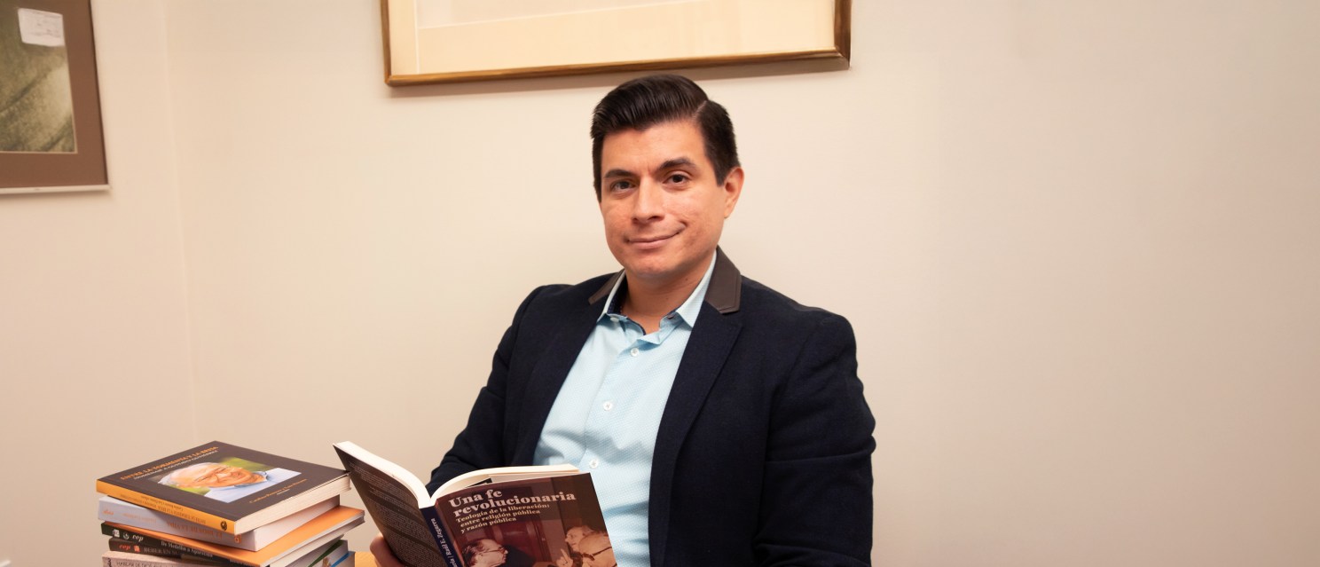 HDS Professor Raúl Zegarra holds a copy of his most recent book “Una fe revolucionaria” (2025), where he studies Gustavo Gutiérrez’s liberation theology and its relevance for today. Next to him, a collection of Gutiérrez’s books in Spanish.